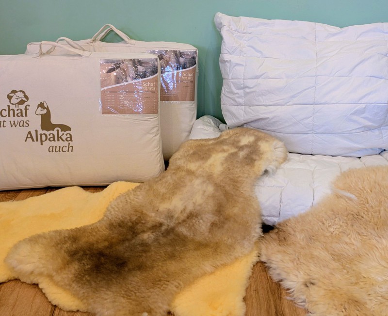 Als Gäste in unserem Ferienhaus und Schlaffass schlaft ihr in den Decken und Kissen aus unserer Schafwolle statt in Synthetikfasern.